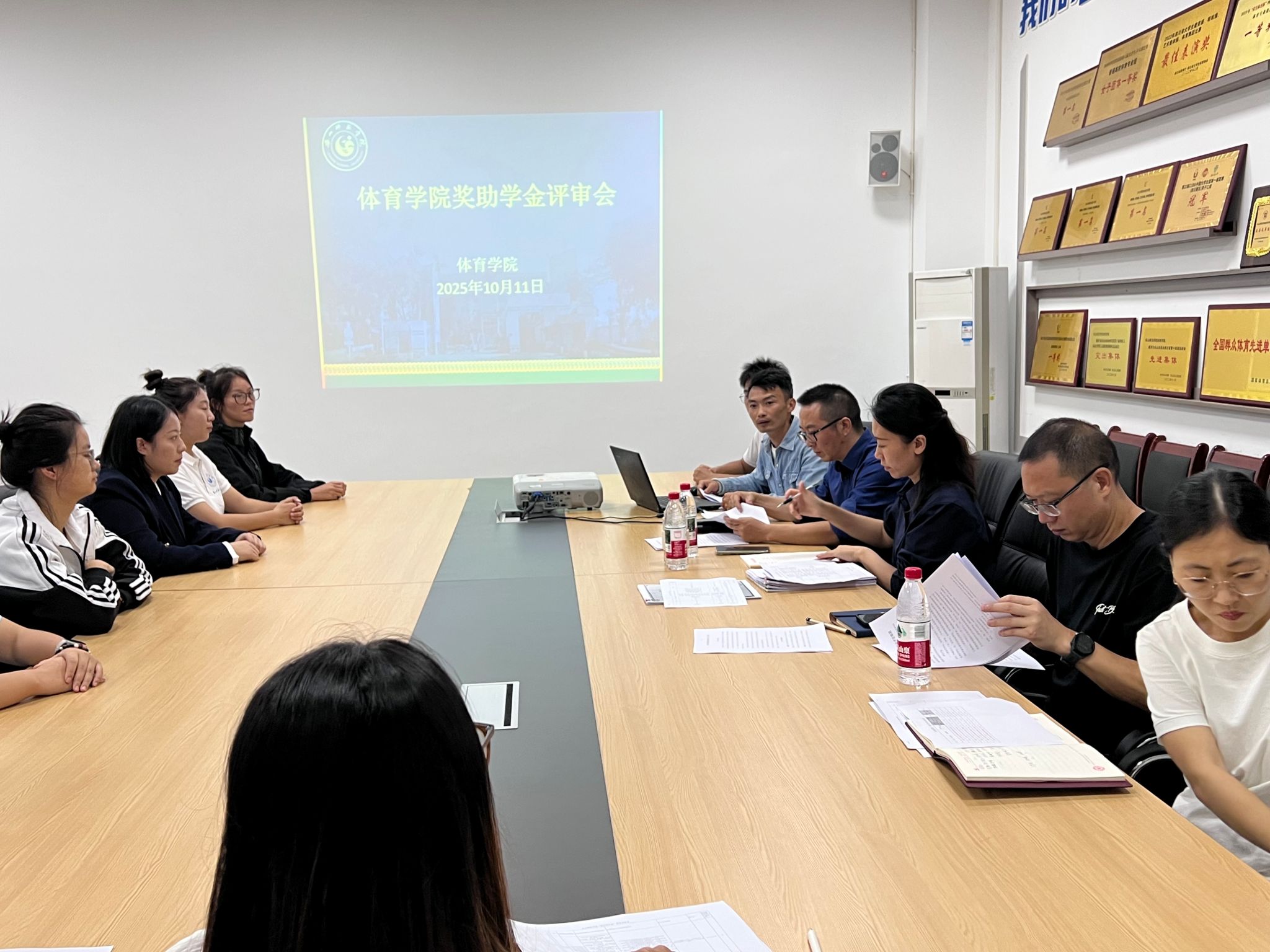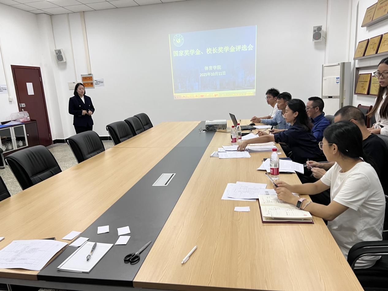 本网讯(文、图/刘宇)为公平、公正、公开地选拔优秀学生获得国家奖学金及校长奖学金,充分发挥奖学金的激励作用,体育学院于2025年10月11日在308会议室组织召开专项评选会。本次评选会由学院评选工作小组牵头组织,小组成员包括学院党委书记林天兴、党委副书记王美、副院长张孝禄、学生管理办公室主任关光富,以及2022级辅导员杜小敏老师、2024级与2025级辅导员赵磊老师。此外,学生代表张雪莲、罗敏、钟京邑、王静共同参会。