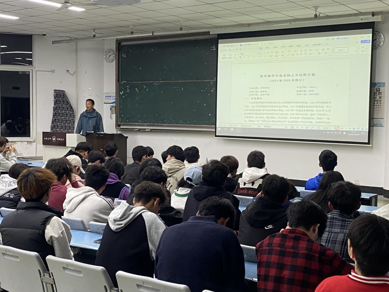 本网讯(文/张锶沁 图/王建勋)为使新生全面了解所学专业,科学规划大学生活,10月26日晚,体育学院为2025级全体新生开展了一场专业介绍会。会议特邀社会体育指导与管理(社体)专业负责人王志刚教授和体育教育(体教)专业负责人鲁长春教授进行讲解,为同学们带来了一场内容丰富、针对性强的专业导学。本次介绍会由体育学院副院长石曼曼主持。