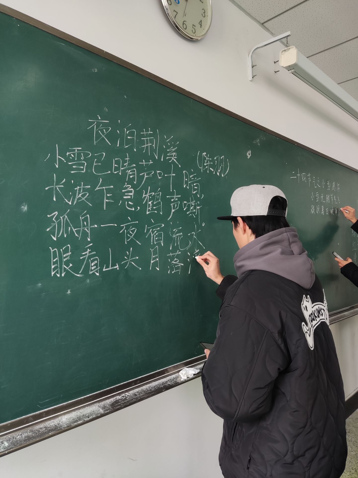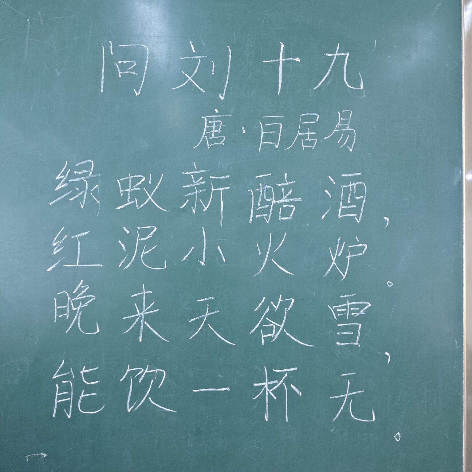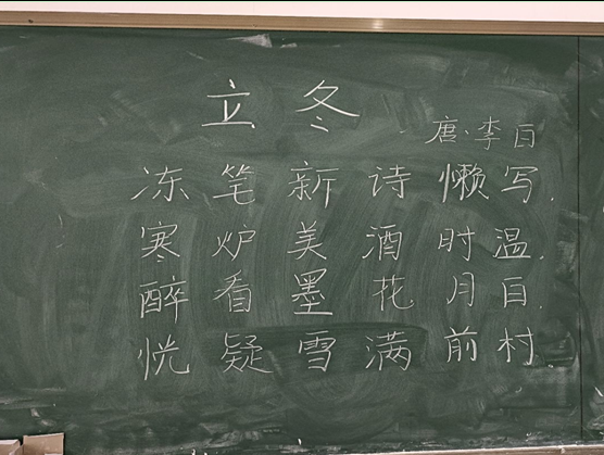 一支粉笔展风采,为提高师范专业学生从教技能、板书书写能力。同学们笔下寄情李白的诗句,“冻笔新诗懒写,寒炉美酒时温。醉看墨花月白,恍疑雪满前村”。寄情白居易的《问刘十九》:“绿蚁新醅酒,红泥小火炉。晚来天欲雪,能饮一杯无”。